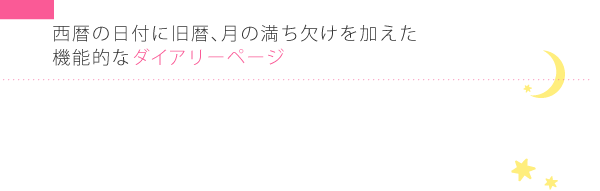 西暦の日付を中心としたカレンダー形式です。前後の月の西暦カレンダーをつけました。日常のスケジュール管理に便利にお使いいただけます。旧暦の月名と日付、月の満ち欠けに加えて、二十四節気、五節句、六曜なども記載しています。ダイアリーの使い始め、使い終わりに不自由がないように、また、旧暦での1年間にもしっかり対応するために、見開き1ヵ月ページは2017年12月分から2019年2月分まであります。今年のデザインでは新月と満月を大きめに表示し、よりわかりやすくなりました。